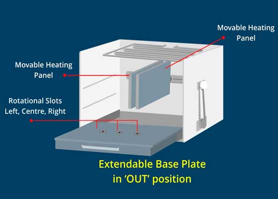 An additional Grill / Broiler Coil is added just below the fixed Grill / Broiler Coil which is at the top of the Microwave Oven. Similarly, the Extendable Base Plate with Rotational Slots replaces the existing base.