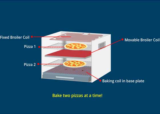 The combination of the Movable and Fixed broiler coils allows the Microwave Oven to now be used as a Toaster Oven, or to bake two pizzas at the same time or even as a Vertical or Horizontal Rotisserie Oven!
