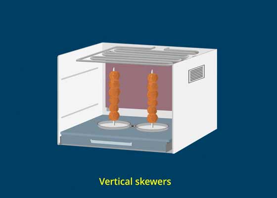 The Movable Heating Panels and the Extendable Base Tray with Rotational Slots for Skewers, Food Stands and Vessels create many unique options to place and cook food items