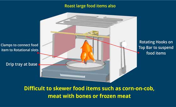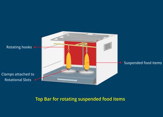 The Top Bar adds an additional dimension to the Microwave Oven allowing it to suspend and rotate food items. The suspended food items can be microwaved or roasted, as required.