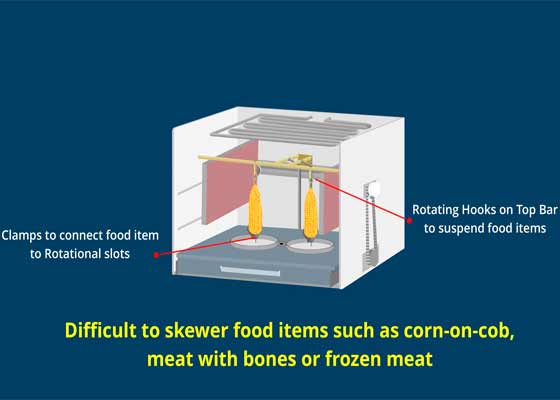 The Microwave Oven market can be expanded considerably by adapting the Movable Heating Panels, Extendable Base Tray with Rotational Slots and the Top Bar to suspend and rotate difficult to skewer food items.