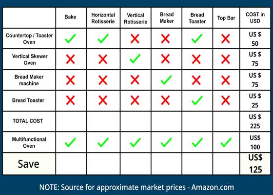 The Multifunctional Oven is a bargain! It combines the functionalities of the Conventional Oven, Toaster Oven , Vertical Rotisserie Oven, Bread Maker and the Bread Toaster at half the combined price of all!