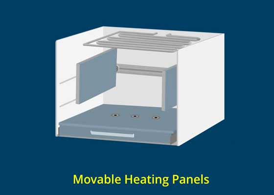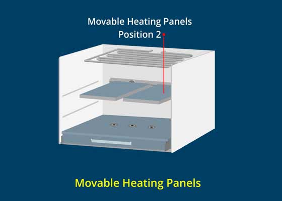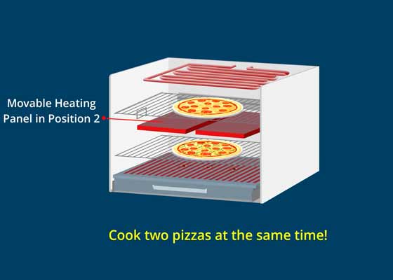 The Movable Heating Panels can be positioned horizontally in the center, dividing the oven cavity in two equal halves, one on top of the other, ideal for baking two pizzas at the same time